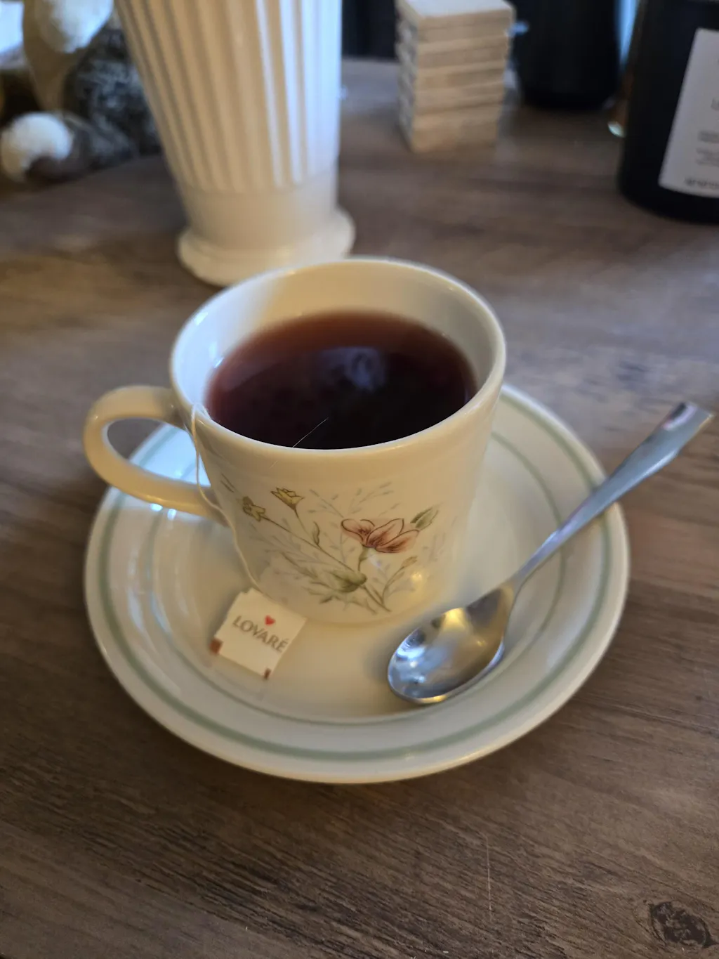 Ingredients: Fine Ceylon black tea, fine Chinese green tea (10%), apple (1.5%), flower petals (cornflower, calendula, safflower, roses) (1.5%), natural Grape flavor