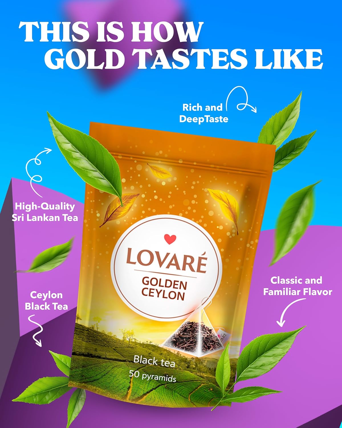 Lovare Golden Ceylon black tea in pyramid bags, 50 pcs.